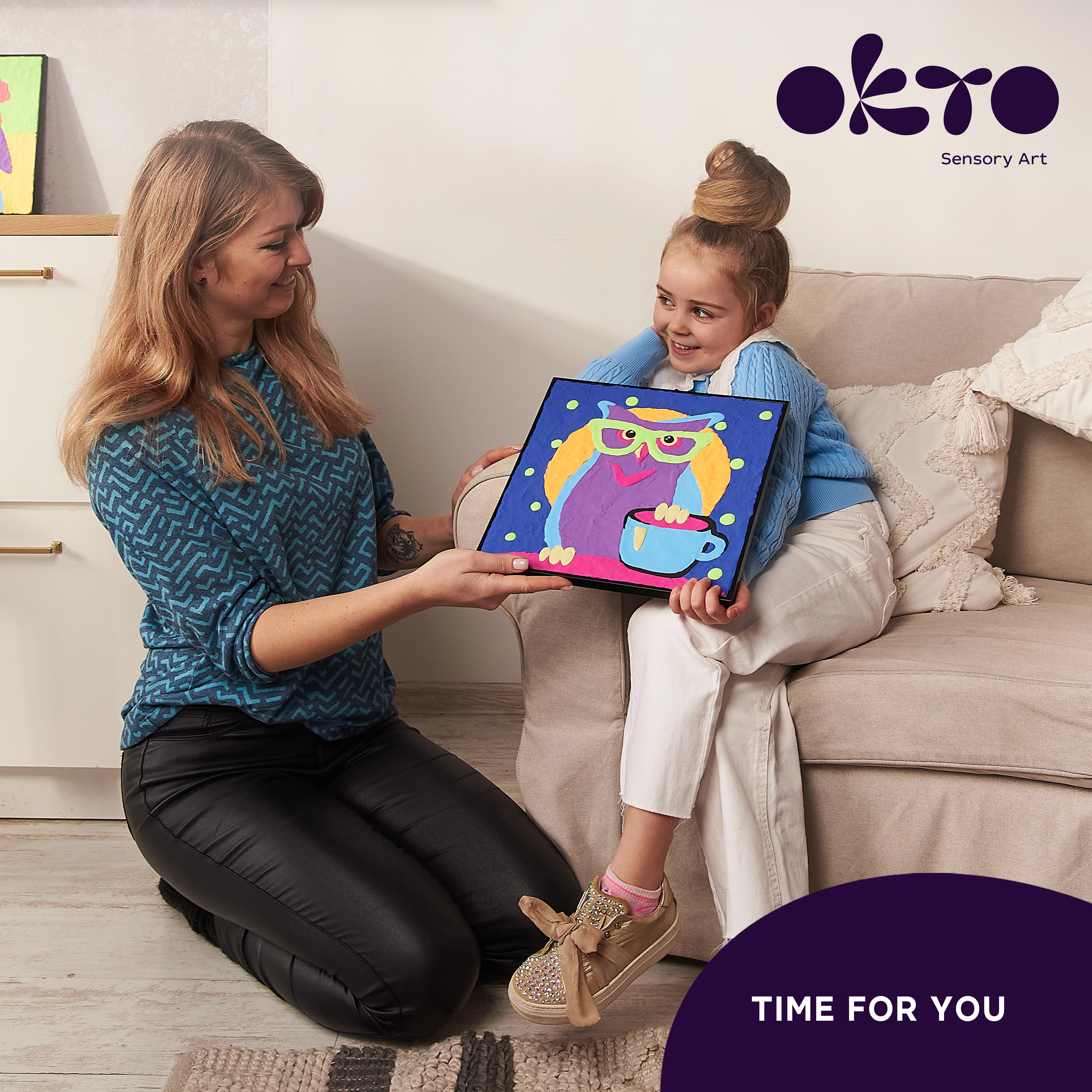 OKTO Ugle kreativt sæt. Selvtørrende masse (air clay), fingermaling. Lærredsstørrelse 29x29 cm. Pakken indeholder – lærred, billedvejledning, formningsværktøjer, selvtørrende masse.