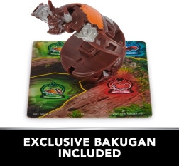 En brun Bakugan med sølvdetaljer åbner sig til kampform, når den ruller over portkortet – en ikonisk transformation som i serien.