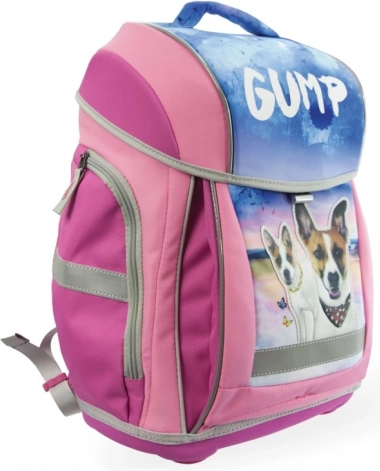 GUMP-motivet og billeder af hunde tilføjer sjov og æstetik, hvilket gør rygsækken unik.