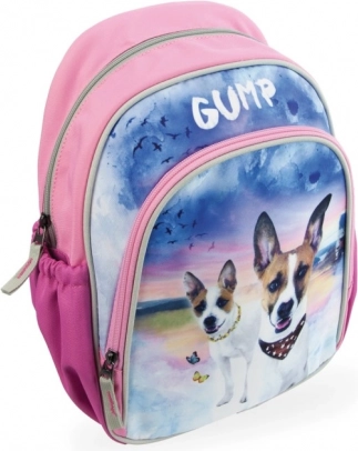 Rygsækken har en farverig forside med illustrationer af hunde og teksten 'GUMP', hvilket gør den til et attraktivt tilbehør.
