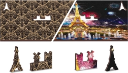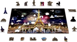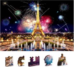 Puslespillet er dobbeltsidet (2-i-1): på den ene side lægger du efter det farverige motiv af Paris om natten med fyrværkeri, på den anden side efter et gentaget mønster udelukkende via brikkernes former. Glatte kanter uden splinter sikres af præcis laserbearbejdning og en solid HDF-plade på 3–4 mm. I æsken finder du også en separat forlæg til mere komfortabel lægning.