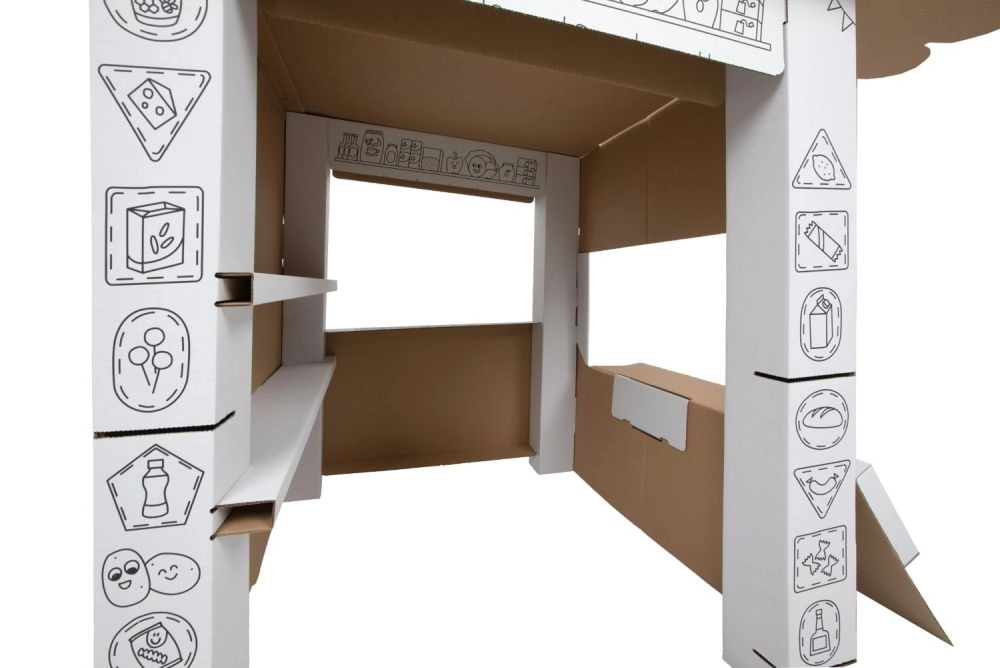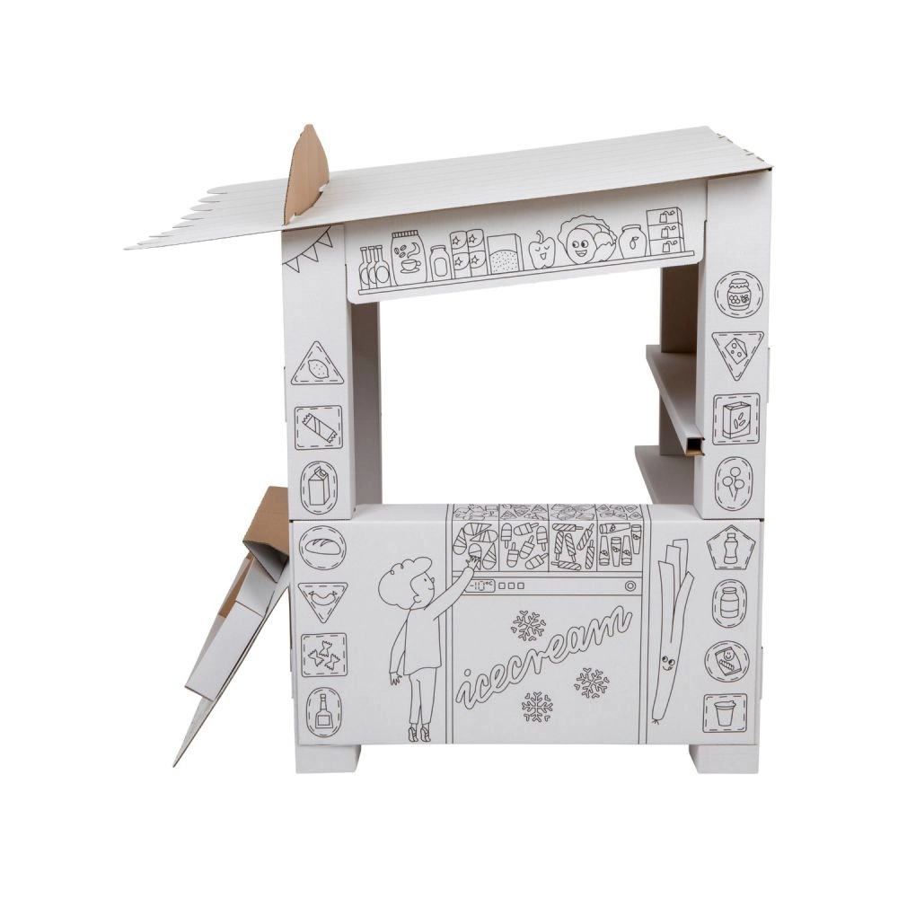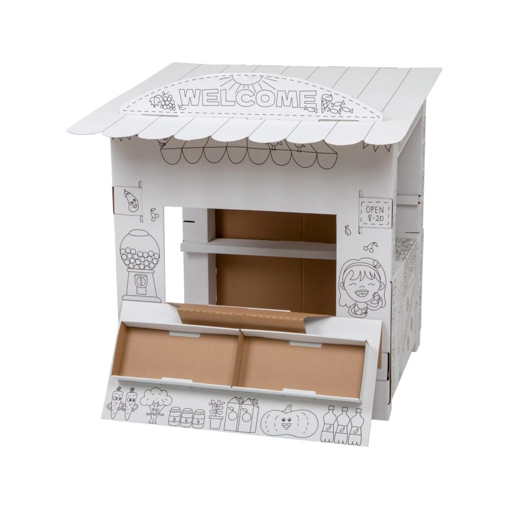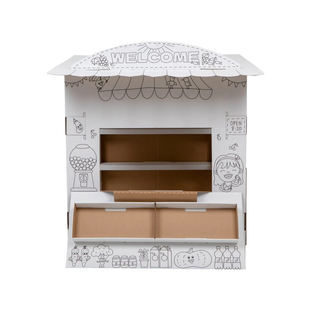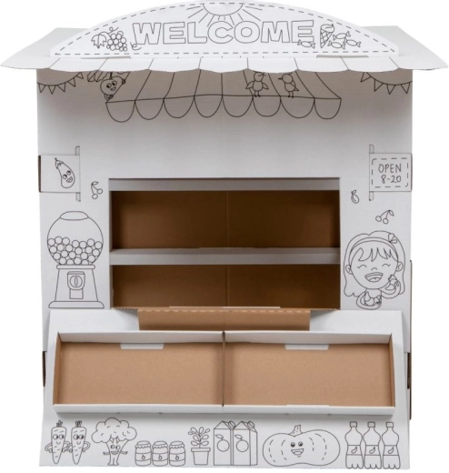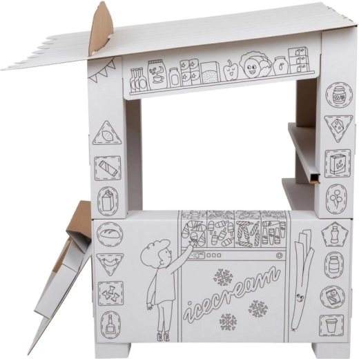 Denne kartonbod giver børn masser af leg og læring i ét. Takket være de sort-hvide konturer kan børn farvelægge med farveblyanter, tuscher eller voksfarver og dermed skabe deres helt egen, originale butik. Det åbne design med klapbar disk og indre hylder er som skabt til leg som ekspedient og kunde.