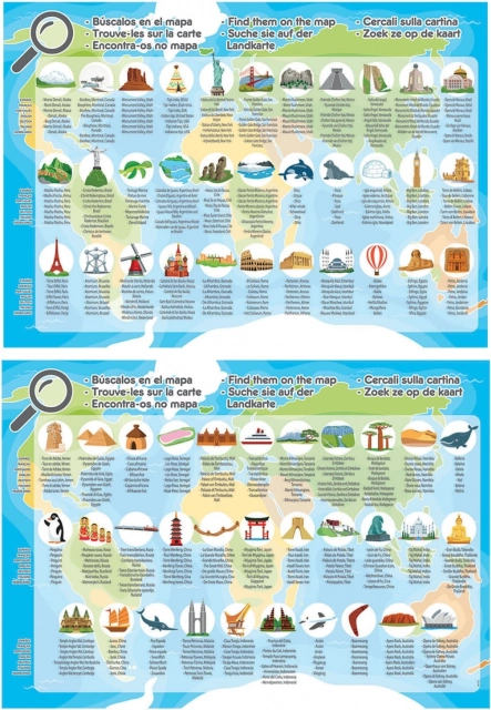 Geografisk puslespil ideelt til børn med et verdenskort og fantastiske illustrationer af verdens seværdigheder. Oplev seværdigheder som Eiffeltårnet, pyramiderne og Frihedsgudinden.