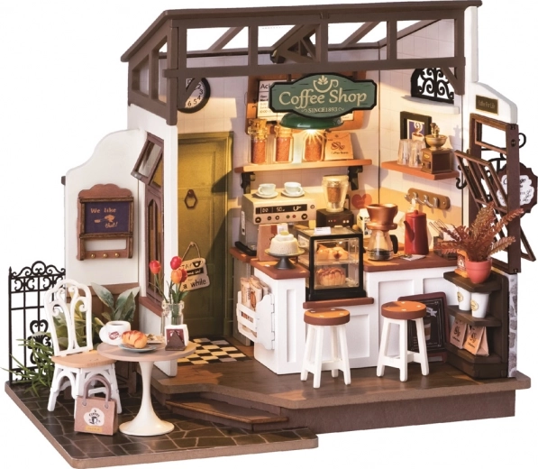 Det detaljerede interiør med disk, skamler og dekorationer skaber en autentisk atmosfære af en hyggelig café. Belysningen fremhæver de fine detaljer og giver modellen charme.
