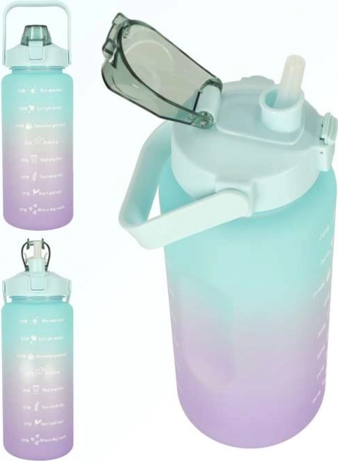 Sportsvandflaske 2 l med praktisk sugerør, tæt låg og motiverende tidsmarkeringer hjælper dig med at holde væskebalancen derhjemme, i fitnesscentret og på farten. Bred hals gør det nemt at rengøre og at tilsætte is eller frugt, det komfortable håndtag sikrer let transport.