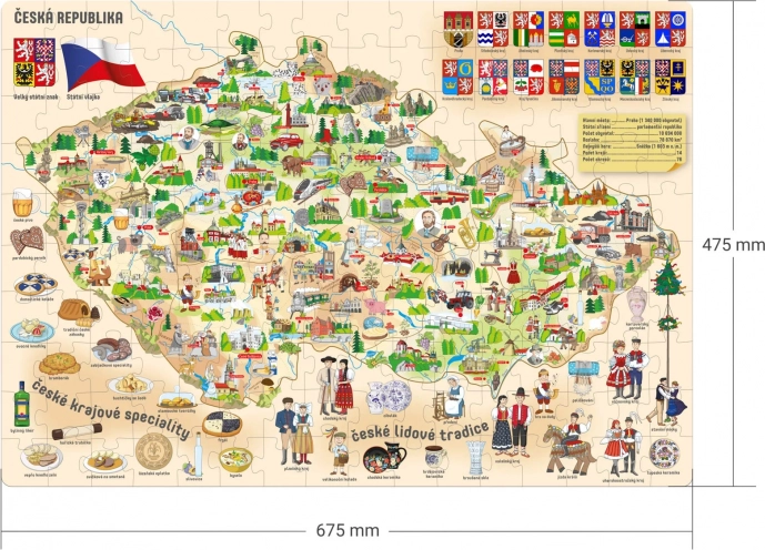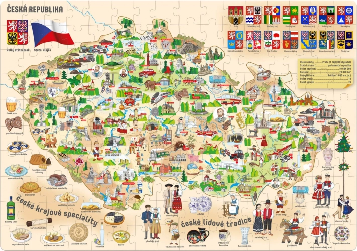 Opdag Tjekkiet på en legende måde med et børnepuslespil over Tjekkiets kort med 160 brikker. Illustrationer af Josef Záruba viser folkelige traditioner, regionale specialiteter, dyr og planter samt flag og statsemblem. At lægge puslespillet udvikler opmærksomhed, fingerfærdighed og koncentration og stimulerer børns fantasi.