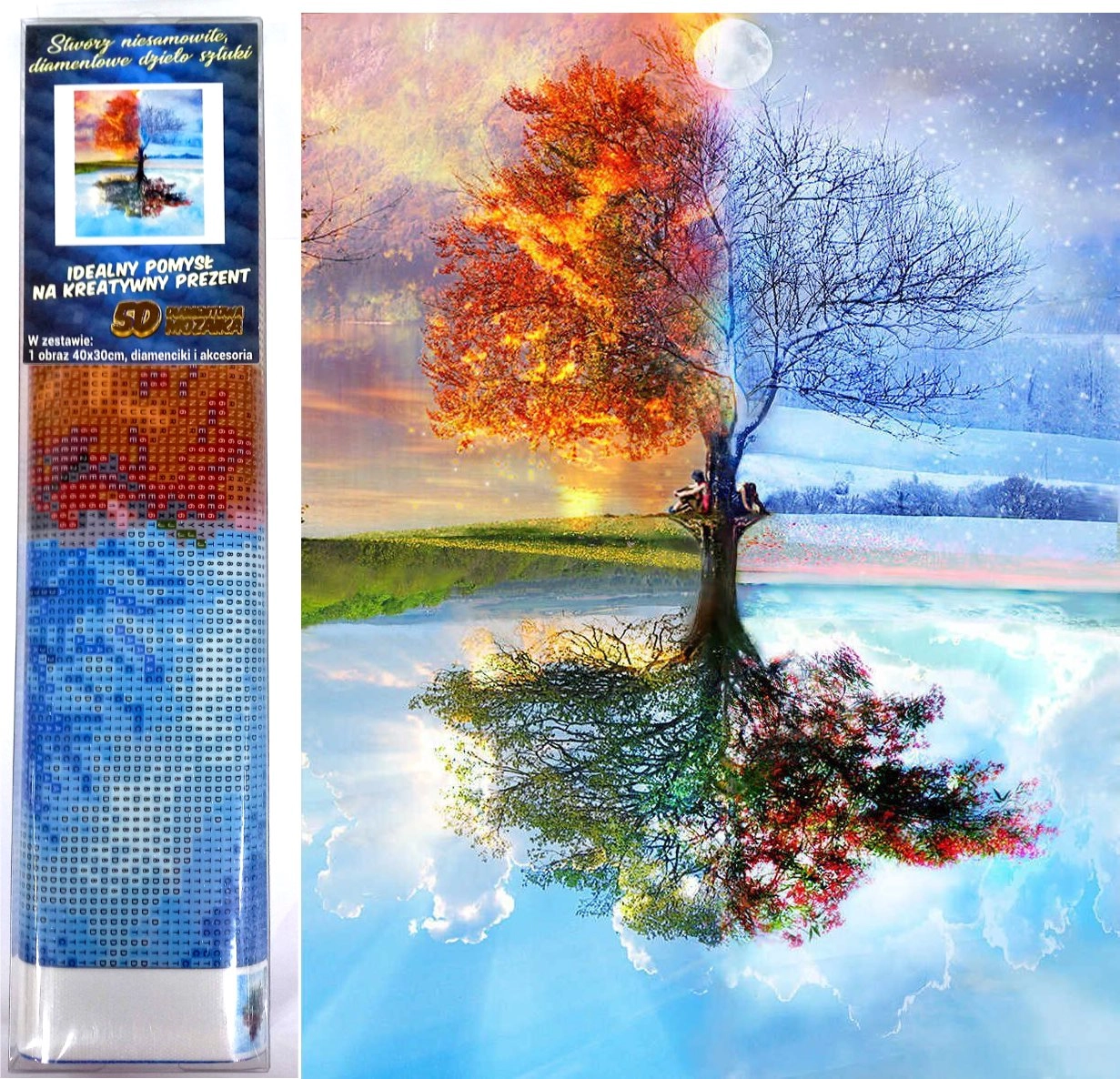 Opdag den afslappende verden af diamantmaling, og skab et imponerende billede med motiv af et træ gennem fire årstider i størrelsen 30 × 40 cm. Sættet indeholder alt, hvad du behøver, og er ideelt som kreativ underholdning for både børn og voksne. Takket være den nemme påføring af sten med pen kan alle mestre teknikken uden tidligere erfaring. Det færdige billede kan nemt indrammes og blive til en original gave eller hjemmedekoration.