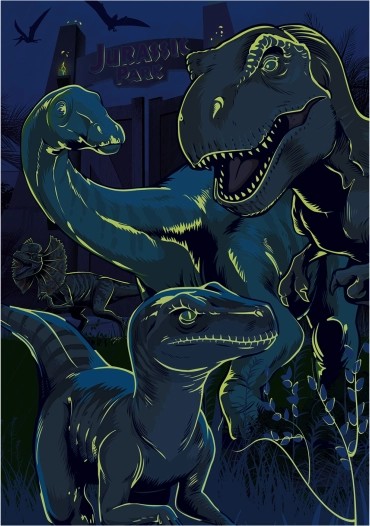 Puslespillet indeholder særlige elementer, som lyser op i mørke og fremhæver konturerne af dinosaurer og bjerge.