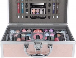 Kosmetikkuffert i pink “Eye-Catcher” med integreret spejl – i alt 42 stk. tilbehør. Indeholder 24× øjenskygger, 2× neglelak, 1× glitter-neglelak, 1× blush, 2× læbestift, 2× lipgloss, 3× eyeliner, 1× øjenblyant, 3× dobbeltsidede applikatorer, 1× pensel. Dermatologisk testet, opfylder EU’s strenge standarder.