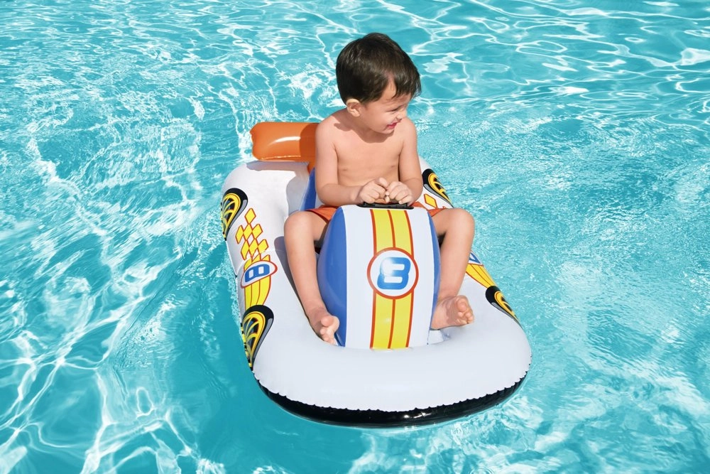 Farverig grafik i racerbil-look motiverer børn til at bevæge sig i vandet og forvandler hver dag ved poolen til en sjov køretur.