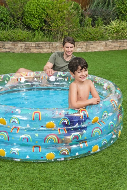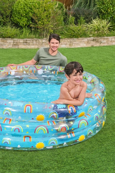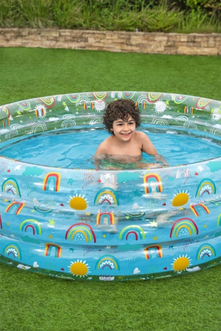 Med regnbue- og solmotiver er denne pool ikke kun praktisk, men også æstetisk tiltalende og indbyder børn til leg.