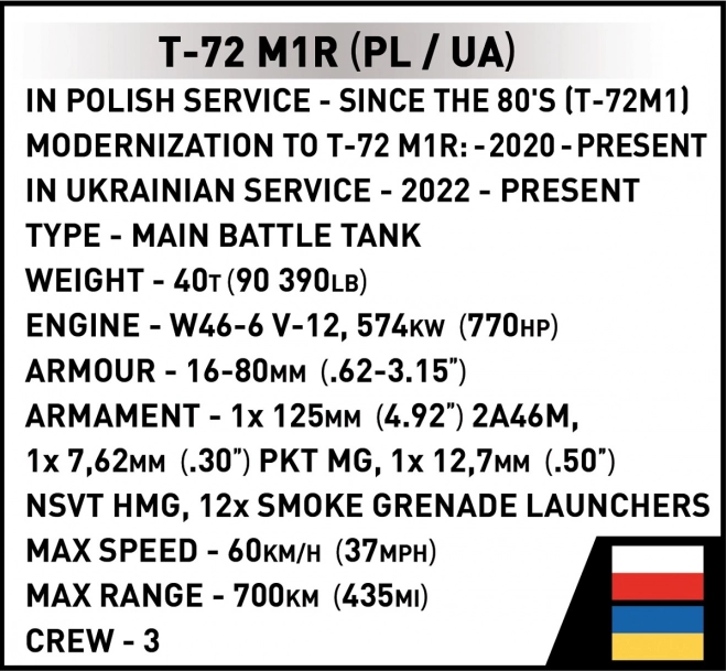 Byg den ikoniske T-72M1R-tank i 1:35 skala af 724 klodser fra COBI. Modellen har en roterende tårn, bevægelige bælter og hjul, åbenbar luge og to minifigurer af tankbesætning (Polen, Ukraine). Der medfølger også nationalflag og nyudviklede dele til et autentisk løbehjul. Et fremragende samler- og læringssæt, kompatibelt med andre mærker.