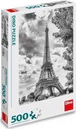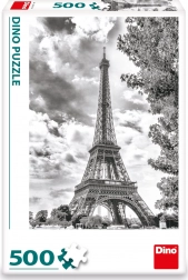 Puslespillet viser det ikoniske Eiffeltårn, et symbol på Paris og Frankrig, i en elegant sort-hvid version.