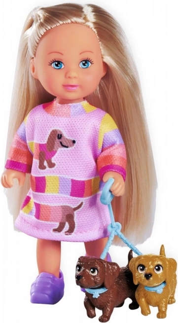 Den søde dukke Evi Love går tur med to bedårende gravhunde. I sættet finder du også et snor, så Evi trygt kan føre sine hunde. En ideel legeting for dyreelskere og kreativ leg.