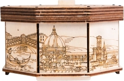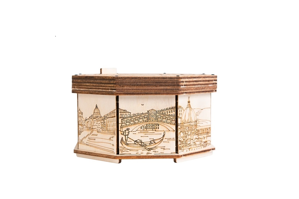 Detaljerede graveringer af byscener og en glat naturlig overflade gør æsken til et stilfuldt tilbehør og en dekorativ genstand.