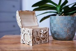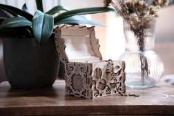 Gør gavegivning til et eventyr. Den elegante trææske med fine udskæringer og dekorative detaljer fungerer som et mekanisk puslespil – modtageren skal finde den rette fremgangsmåde for at nå ind til den skjulte overraskelse. Takket være den høje kvalitet er boksen ikke kun funktionel, men også et dekorativt indslag i indretningen.
