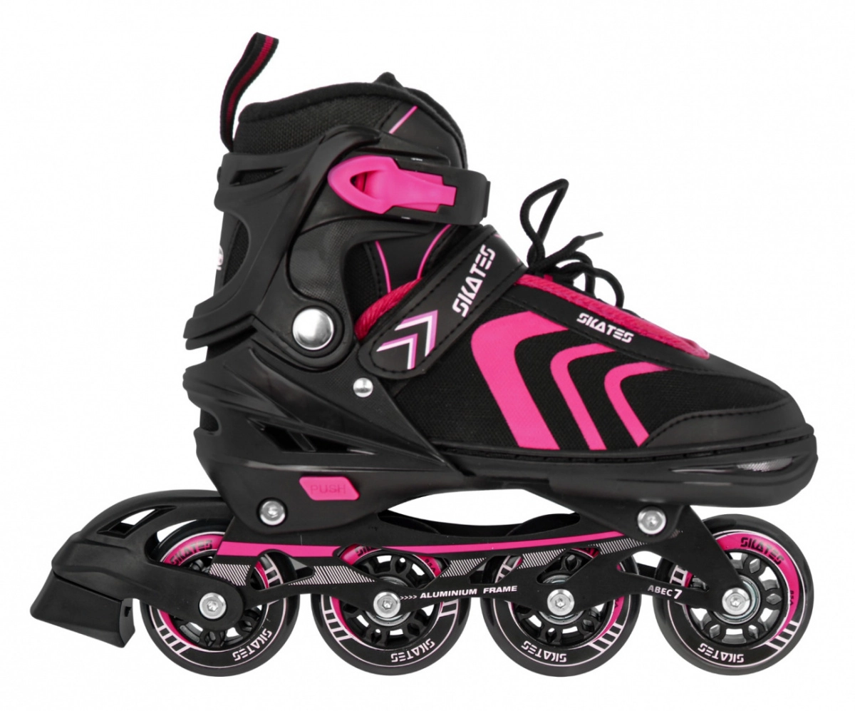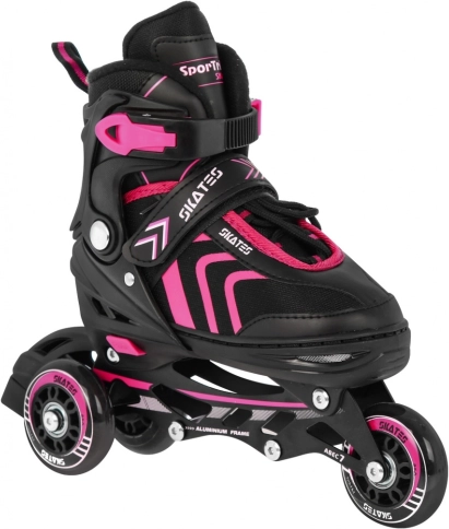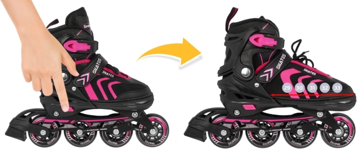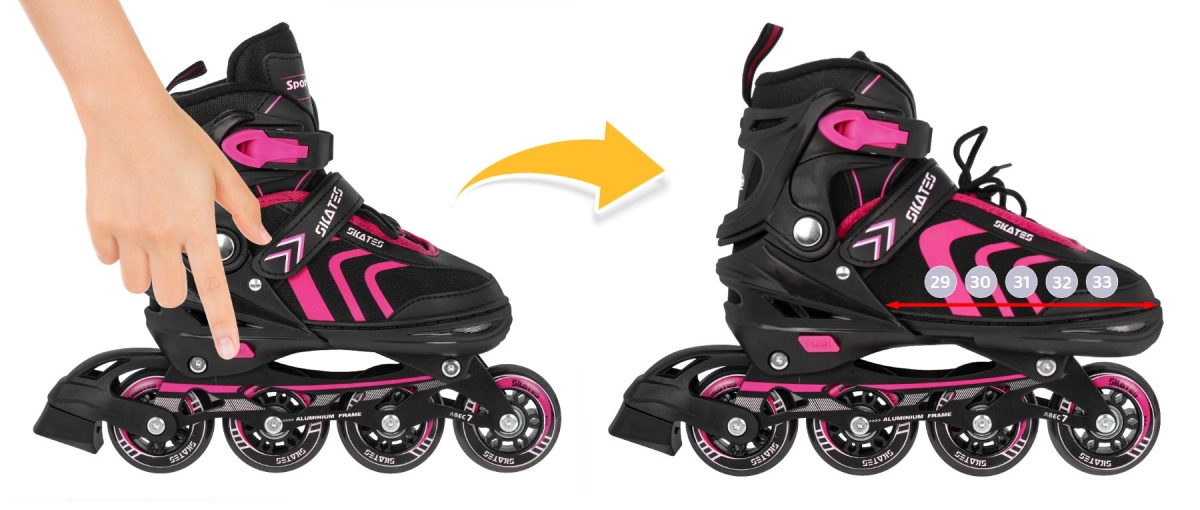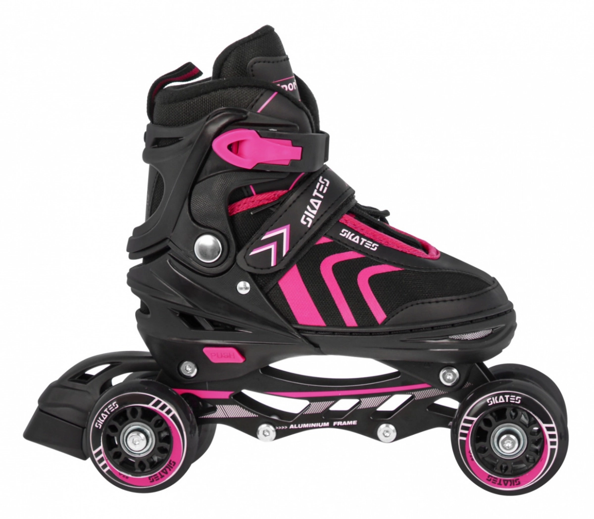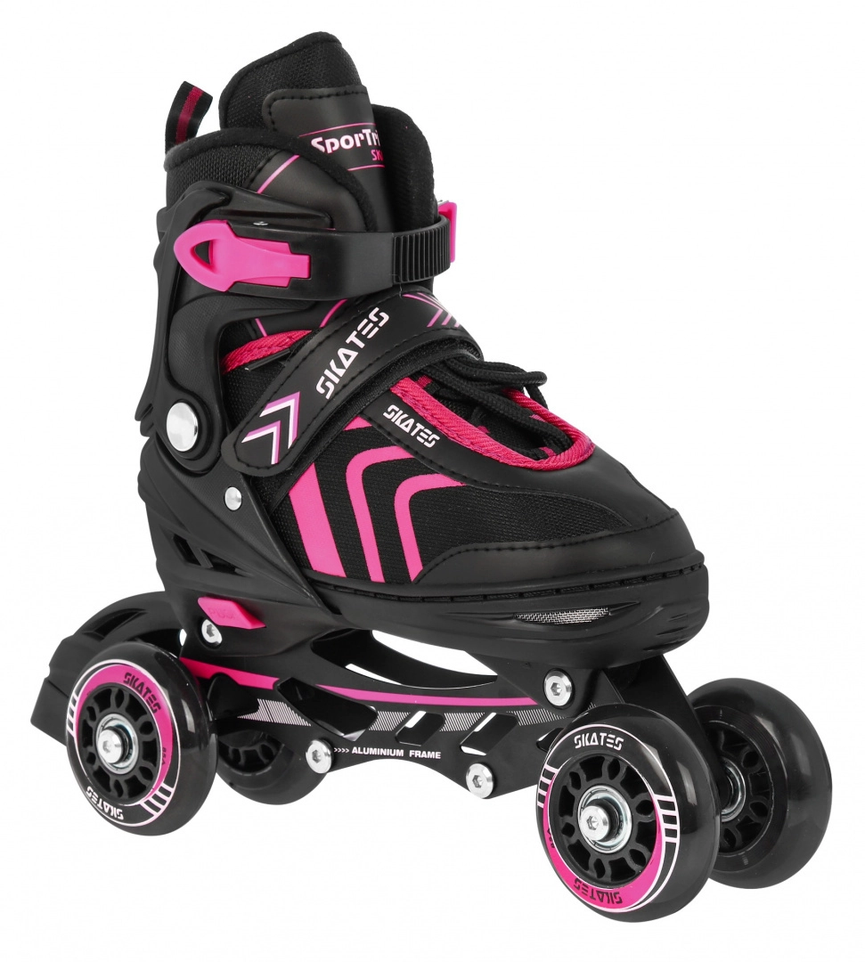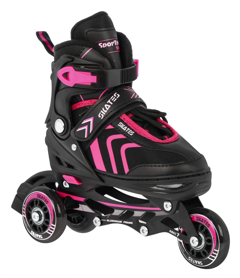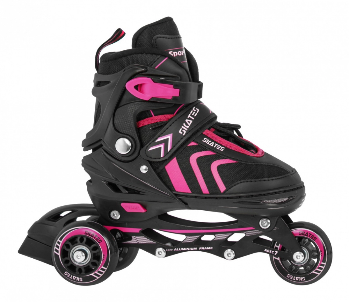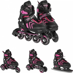 Universal børnesæt 4-i-1 kombinerer inline-skøjter, trekhjulsskøjter og isskøjter i én. Takket være 5-trins størrelsesjustering 29–33, behagelig polstring af blødt EVA-skum, ventilation og sikker lukning med snørebånd + velcrorem + spænde giver de sikkerhed og komfort. Aluminiumsramme, ABEC 7-lejer og PU-hjul 64 mm (85A) sikrer en glidende kørsel, mens et rustfrit stålblad giver tryghed på isen.