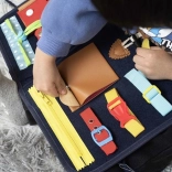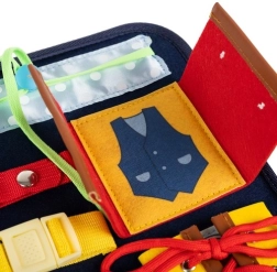 Indeholder 14 forskellige elementer, herunder lynlåse, spænder, knapper og andre, der fremmer praktiske færdigheder og selvstændighed.