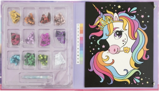 Kreativt sæt til billeder efter tal: enhjørning eller hund, 20×25 cm, 12 farver og doseringspen. Udvikler finmotorik og koncentration. Til børn fra 3+.