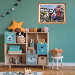 En dynamisk scene med Spider‑Man, Miles Morales og Doctor Octopus glæder små tegneseriefans og motiverer til at lægge puslespil.
