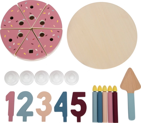 Den træfødselsdagskage til at skære fra small foot Tasty forvandler børneværelset til en glad fest. Seks realistiske stykker med lyserød “creme” og drys samles med velcro til en hel kage, som børnene nemt kan “skære” med den medfølgende spatel. Aftagelige lys, creme-stykker og tallene 1–5 indbyder til fantasifuld pyntning og læring af tal og farver.