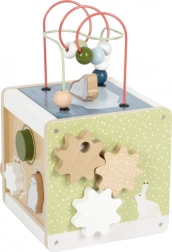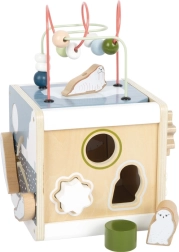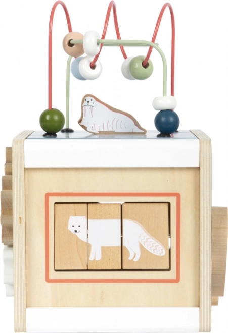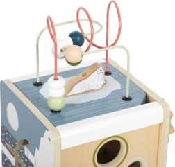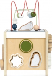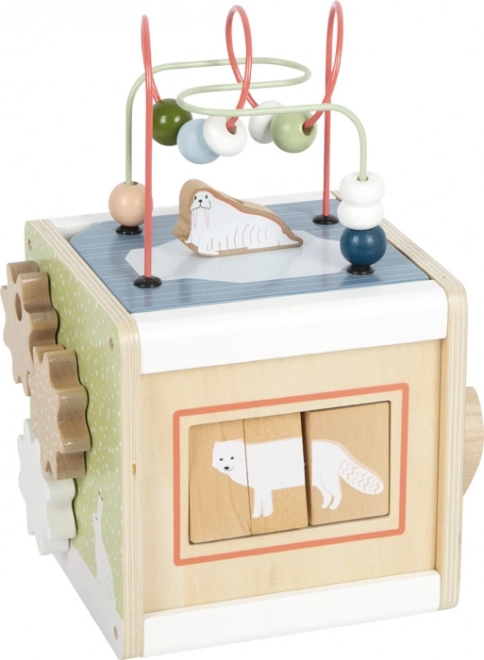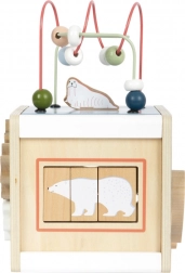 Giv børn uendelig sjov og læring med den træbaserede motorikterning SMALL FOOT ARCTIC af 100% FSC træ. På fem sider tilbyder den perleløbebaner, former til indsætning, skydelabyrinter, tandhjul og drejeelementer, som understøtter finmotorik, logik og genkendelse af farver og former. Det aftagelige låg gør det nemt at opbevare delene, afrundede kanter sikrer sikker leg, og det moderne arktiske design passer smukt ind på børneværelset.