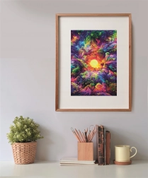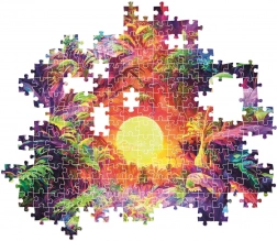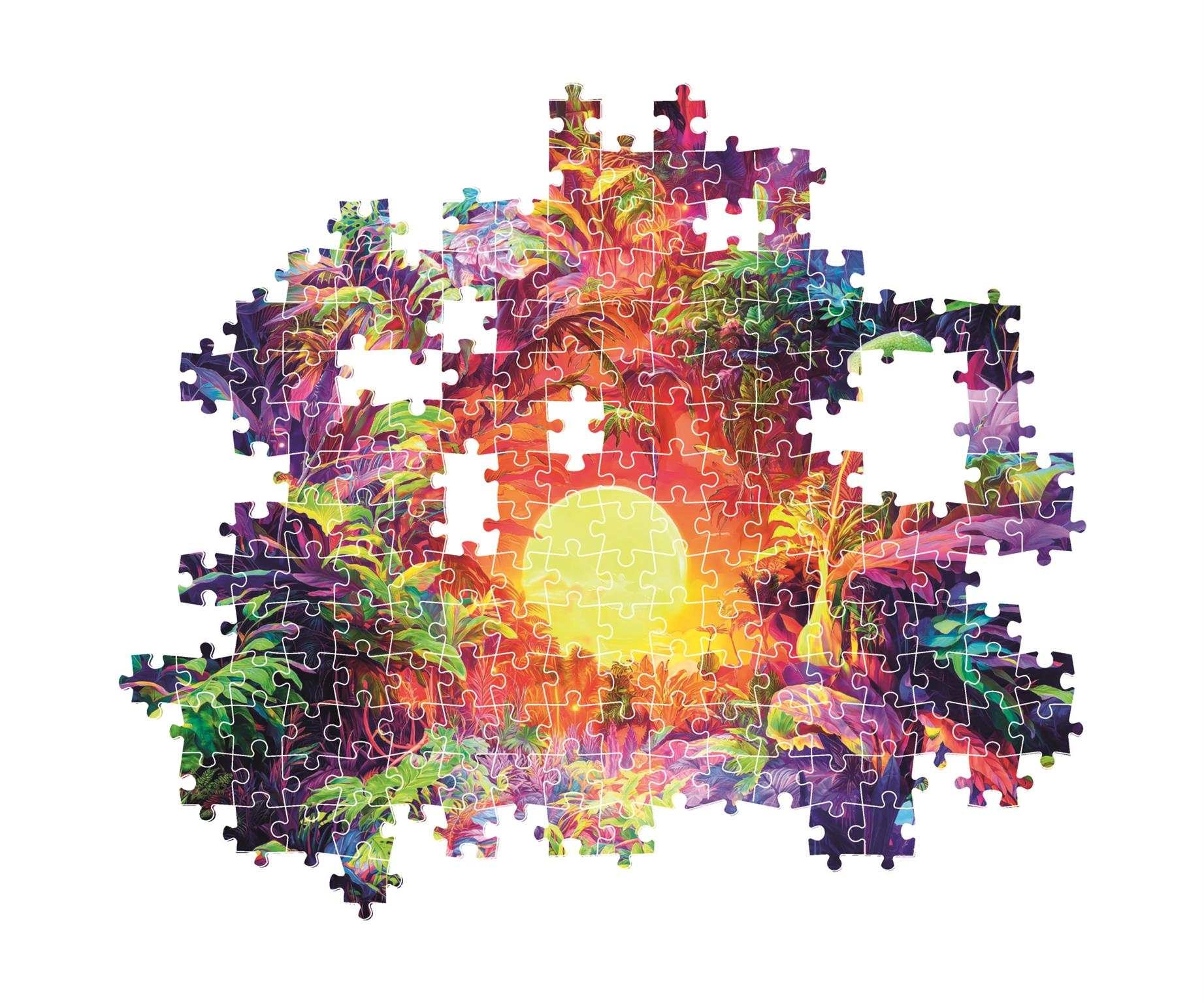 Træd ind i en strålende komposition med motiv af psykedelisk solopgang i den tropiske jungle. Den kompakte emballage sparer plads og skåner miljøet, men giver stadig en fuldendt puslespilsoplevelse. Kvalitetstryk og præcis stansning sikrer problemfri samling af brikkerne og modstand mod slitage.