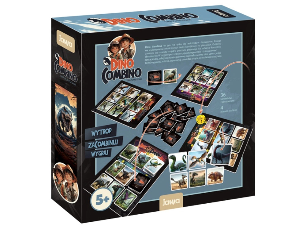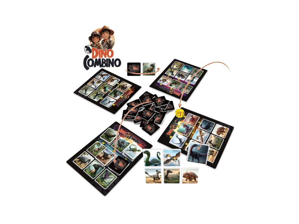 DINO Combino er et fremragende valg for alle dinosaurfans. Målet er at være den første til at udfylde sin spilleplade med de rigtige dinosaurer. Spillerne skiftes til at kaste terningen, vende brikker og tildele dem klogt. Succes afhænger af god hukommelse, opmærksomhed og smart kombination.