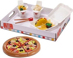 Børn kan lege leveringsbud og kunde, pakke menuer i take-away madkasser og servere det hele på et fad, som selve emballagen bliver til. Det realistiske udseende af maden og kombinationen af plast- og filtdele gør sættet ideelt til køkkenleg og fælles middagsselskaber med venner.