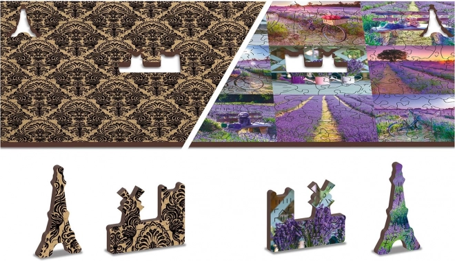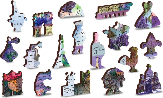 Forkæl dig selv med afslapning med et kvalitets træpuslespil med motiv af lavendelmarker. Den dobbeltsidede 2-i-1 udførelse gør det muligt at lægge både efter det farverige billede og efter bagsiden med gentaget mønster – ideelt for dem, der elsker gennemtænkte udfordringer og præcis udførelse.