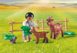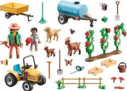 Sættet indeholder: to Playmobil-figurer, en hund, to geder, en traktor med trailer, en vandtank og en masse ekstra tilbehør, der øger historiens realisme.