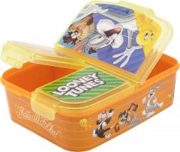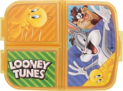 Den stilfulde multiboks til madpakke med LOONEY TUNES-helte kombinerer praktisk opdeling og et sjovt udseende. Tre separate rum holder maden adskilt, frisk og pænt organiseret – fra sandwich over frugt til små godbidder. Den robuste konstruktion af holdbar plast klarer daglig brug, tab og stød.