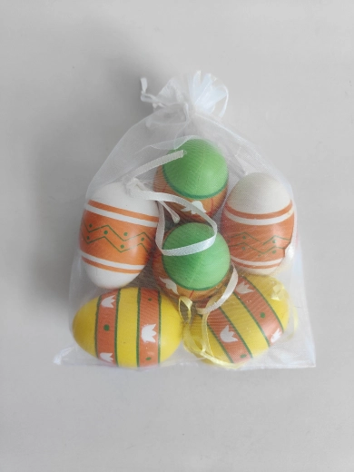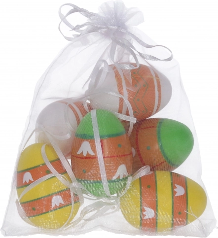 Giv dine dekorationer nyt liv med disse smukke malede plastæg i størrelsen 6 cm, som er pakket i 6 styks i en elegant organzataske.