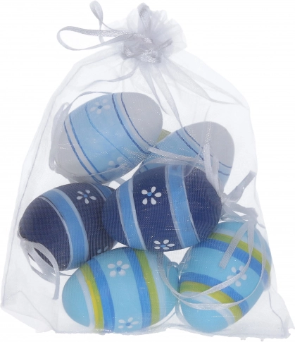 Dekorative plastæg, der forskønner dit hjem. Hvert æg måler 6 cm og pakken indeholder 6 stk i en elegant organzapose.
