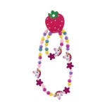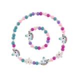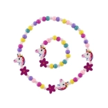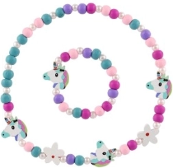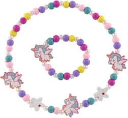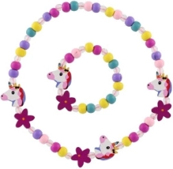 Dette legesyge smykkesæt til børn – halskæde og armbånd – begejstrer med glade farver, perler og vedhæng med motiver af enhjørninger og blomster. Kombinationen af træ og plast er let, behagelig at røre ved og egnet til daglig brug.
