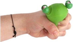 Når man klemmer på dyret, buler øjnene komisk ud – øjeblikkelig latter og afspænding ved hvert tryk.