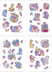 Nyd sjov og kreativ pynt med midlertidige tatoveringer MY LITTLE PONY. Pakken indeholder 4 ark fyldt med farverige motiver af de populære ponyer, som nemt påføres med vand og lige så let fjernes. Et fremragende valg til børn fra 3 år, fester og leg i hverdagen.
