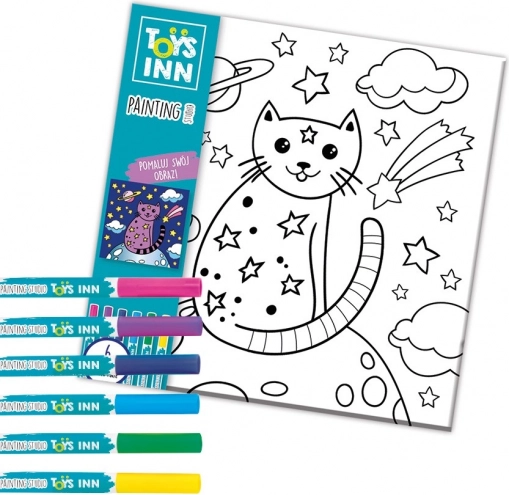 Kreativt sæt til børn: lærred 29×29 cm med kattemotiv og 6 farvede tuscher. Farvelæg, udstil og skab en original dekoration til børneværelset.
