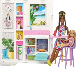 Medfølger BARBIE-dukke og 11 stilfulde tilbehør – service, 2 stole, lille håndklæde og tæppe – som pynter interiøret og inspirerer til ny leg. Grafiske motiver som affaldssortering, planter, solpaneler på taget og en elbil lærer børn om miljø på en diskret måde.