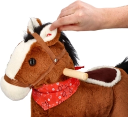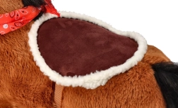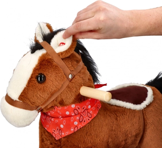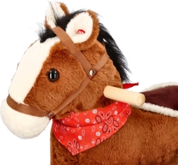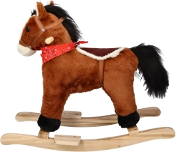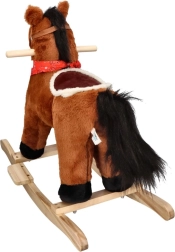 Gyngehesten i brun farve med blød plysoverflade, sæde og dekorativt tørklæde er en ideel ledsager til daglig leg. Takket være den solide trævippe kan barnet gynge sikkert, udvikle motorik og øve koordination.