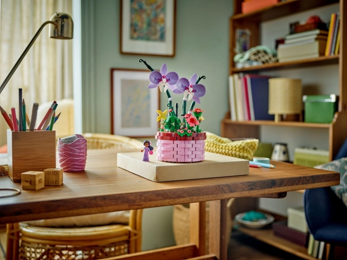 Dette detaljerede byggesæt begejstrer børn fra 9 år og voksne fans af Encanto. Den hængslede blomsterkrukke åbnes og afslører Isabelas smukt indrettede værelse med seng, lampe, blomster og plads til minidukken. Når den lukkes, kan blomsterne arrangeres til en stilfuld dekoration, der pryder hylden eller arbejdsbordet.