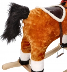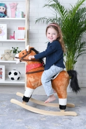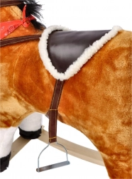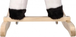 Træmederne sikrer stabilitet og jævn bevægelse, håndtag og stigbøjler giver en tryg følelse både når man sætter sig op og under ridningen. Hesten passer både til hverdagens leg og som en stilfuld detalje i børneværelset.