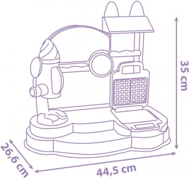 Med følger en “ismaskine”, vaffeljern og masser af tilbehør – kræmmerhuse, bægre, skeer og toppings til uendelige kombinationer.