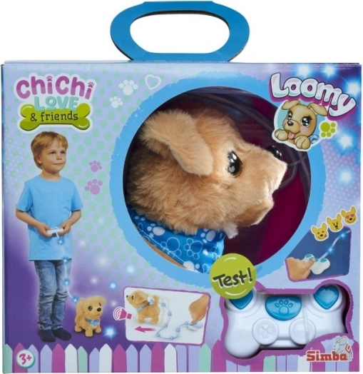 ChiChi Love Loomy med lysende kabel kan gå, gø og logre med halen. Den hvide fjernbetjening formet som et hundeben er forbundet til hunden med et kabel, så den er nem at styre. Et særligt ekstra er det lysende snor. Når knappen trykkes ned og holdes, aktiveres lysfunktionen automatisk, så børn kan gå tur med hunden selv i mørke.