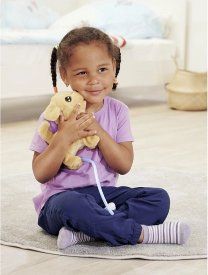 - Sikker legetøj til de mindste – hvalpen er 20 cm høj, har store broderede sorte øjne og en plastiknæse. Den har regnfrakke på. Kører på batterier (inkluderet).
