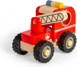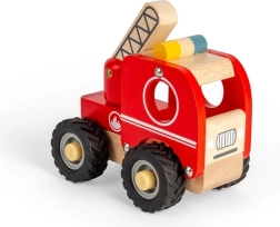 Træbrandbil til fantasifuld leg, ideel til udvikling af motorik og hånd-øje-koordination. Kombinationen af rød lak og naturtræ fanger ethvert barns opmærksomhed.