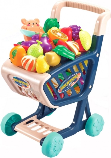 Sød børne-indkøbsvogn med rigt tilbehør er ideel til små husholdere og små butiksdrivende. Indeholder plastikfrugt og -grønt, som kan “skæres” med sikre værktøjer. Legetøjet understøtter finmotorik, fantasi og læring om madvarer gennem sjov rolleleg som butik.