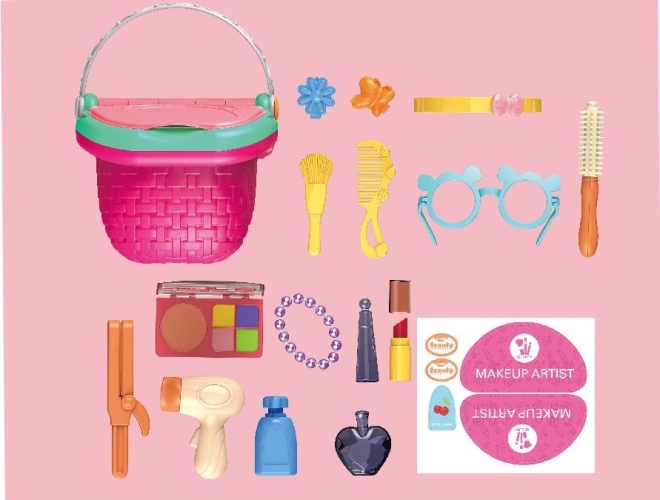 Oplev magien ved makeup og hårpleje med dette søde legesæt i en praktisk kurv. Her finder du op til 18 accessories som parfume, læbestift, øjenskygger, hårtørrer og hårtilbehør – ideelt til kreativ leg og udvikling af fantasien.