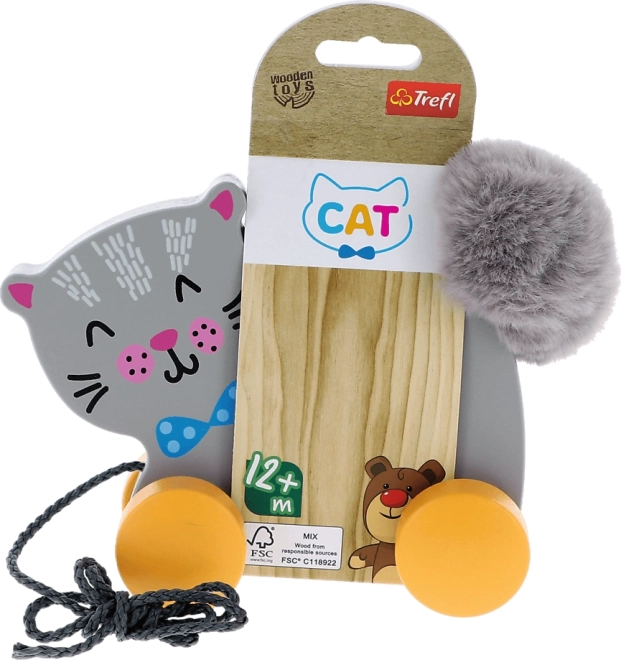 En sød trækat på snor vil glæde enhver tumling. Den er lavet af naturligt træ, har glatte former til små hænder og takket være hjulene “løber” den trofast efter barnet. Understøtter de første skridt, udvikler finmotorik og greb og stimulerer sanserne med en blød hale. Overfladen er behandlet med ikke‑giftige, sikre farver.