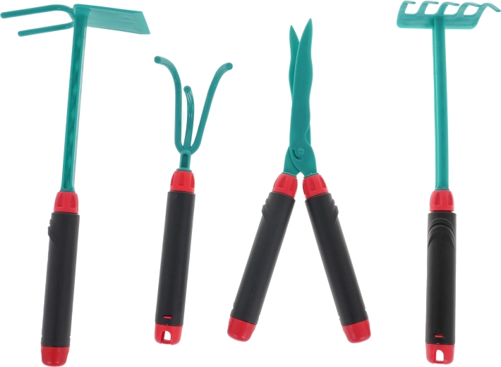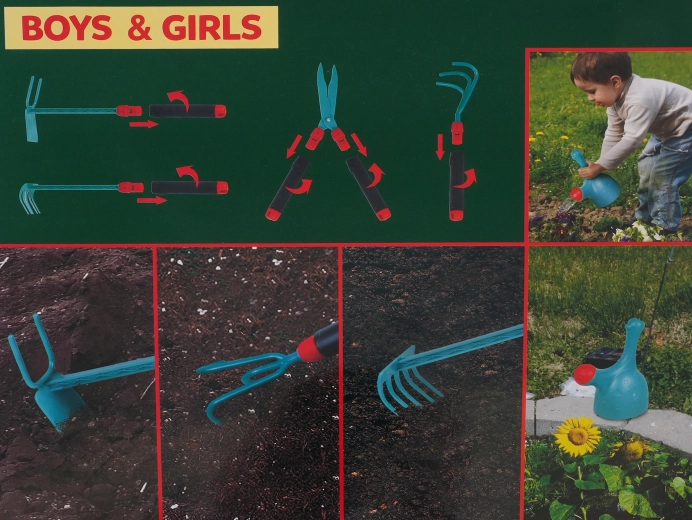 Sæt med sikre haveværktøjer til børn fra 3 år. Sættet indeholder alt, hvad der er nødvendigt til havearbejde. Værktøjet er sikkert, har ingen skarpe kanter og har en ideel størrelse til små hænder. Værktøjsgrebene er desuden aftagelige. Sættet er i et universelt farvedesign, som er ideelt til både drenge og piger. | |